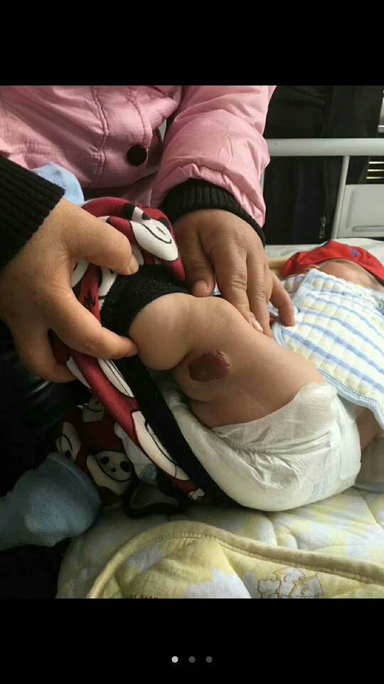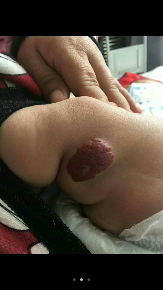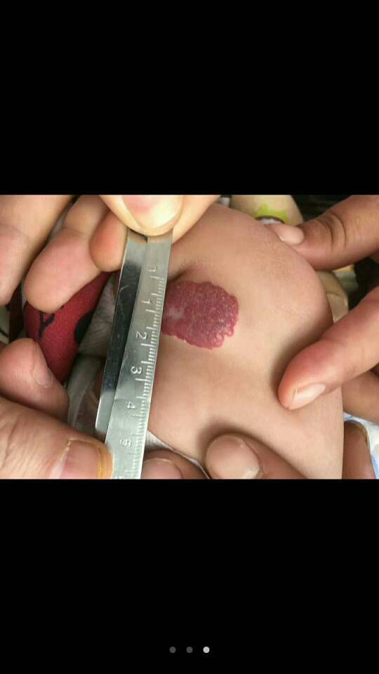 圖為六個月嬰兒體表血管瘤??梢缘鹊揭恢軞q后行硬化治療。